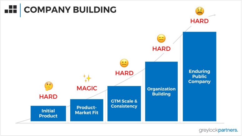 Each stage of company building carries different risks, from a maniacal focus on defining an initial product and just shipping it, to the iteration of finding product-market fit. Next comes figuring out how to grow the user or customer base efficiently and consistently — and then when you have that growth formula, pushing as fast (often much faster) than you can manage — in order to achieve market leadership and establish your defensible moats. If the customer base grows, then you suddenly need to build a company that can support that growth — an executive team of leaders and an organization that can operate and adapt effectively without the founder driving every decision. Finally, if you’re right, lucky and have executed exceptionally well, you prepare to face the public markets, navigating the IPO process and becoming an enduring, public company.