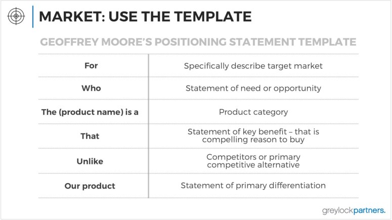 For anyone who hasn’t seen Geoffrey Moore’s classic template, it’s a great place to start in terms of describe your market and your positioning. Try to write this, then test it with your target customer, and other people who know that customer well (advisors, the channel, salespeople).